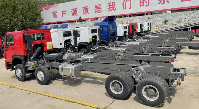 –All dump trucks are equipped with high tensile steel leaf springs suspension and reinforced double-layer chassis.